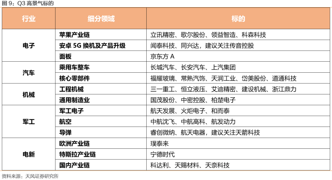 类似去年Q4(当时涨幅靠前的行业是半导体、家电、水泥、工程机械),今年的最后4个月市场风格会相对均衡,一方面,顺周期的白酒、白电、水泥、化工细分、航空有相对收益的概率较大;另一方面,Q3业绩能够爆发并延续的军工、光伏、新能源车、消费电子、工程机械、汽车零配件、生产线设备等,具体可以参考下面表格: