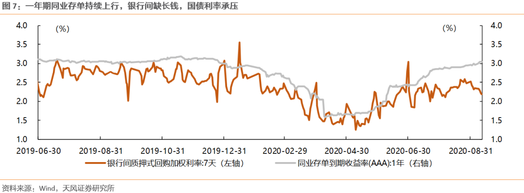 (2)居民信贷端:房企“345新规”试点,房企加大销售回款,预计今年“金九银十”成色十足,居民中长期贷款将维持。通常9、10月是商品房销售高峰(金麒麟分析师),居民中长期贷款在9月都比较坚挺,今年预计要好于去年。从逻辑上看,“345新规”设置“三道红线”,融资收紧,负债率与融资渠道直接挂钩。房企急于以价换量,加大销售回款。一是弥补现金流缺口,降低财务风险,二是降低负债率,满足融资新规。从数据上看,样本46城,9月前10日商品房销售面积就达到去年同期35.28%。而房企促销政策,例如恒大7折房,普遍从9月中旬左右才开启,因此预计今年“金九银十”成色十足,居民中长期贷款将维持。