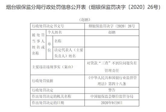 此外,相关责任人赵鹏对贷款“三查”不到位问题负有管理责任,受到警告处分。