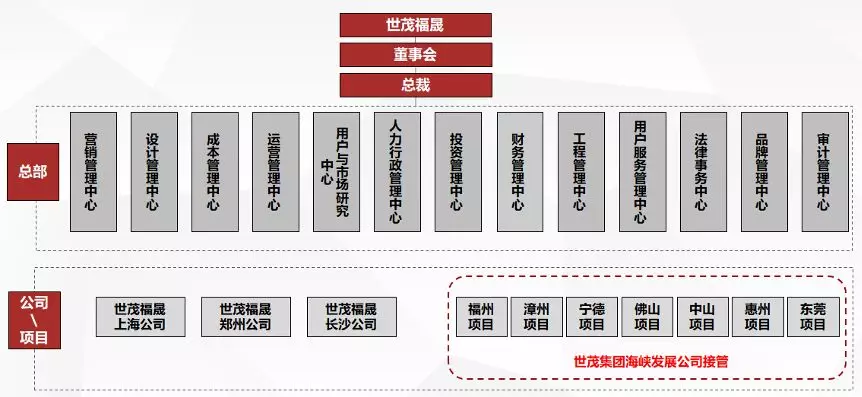 世茂在对福晟原有高管大换血的同时,还对福晟组织架构进行了大刀阔斧的重建。3月开始,原福建福晟总部更名为世茂福晟总部,世茂福晟上海公司、郑州公司、长沙公司也进行了重组,原福建福晟的多个区域包括福州、广州、惠州、漳州等被直接接管。