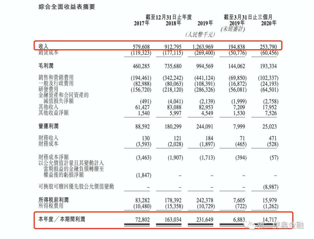 招股书显示,2017-2019年,明源云实现营收5.79亿元、9.13亿元、12.64亿元;同期毛利润分别为4.6亿元、7.36亿元、9.95亿元,毛利率分别为79.45%、80.61%、78.72%;同期净利润分别为0.73亿元、1.63亿元、2.32亿元,净利率分别为12.61%、17.85%、18.35%。