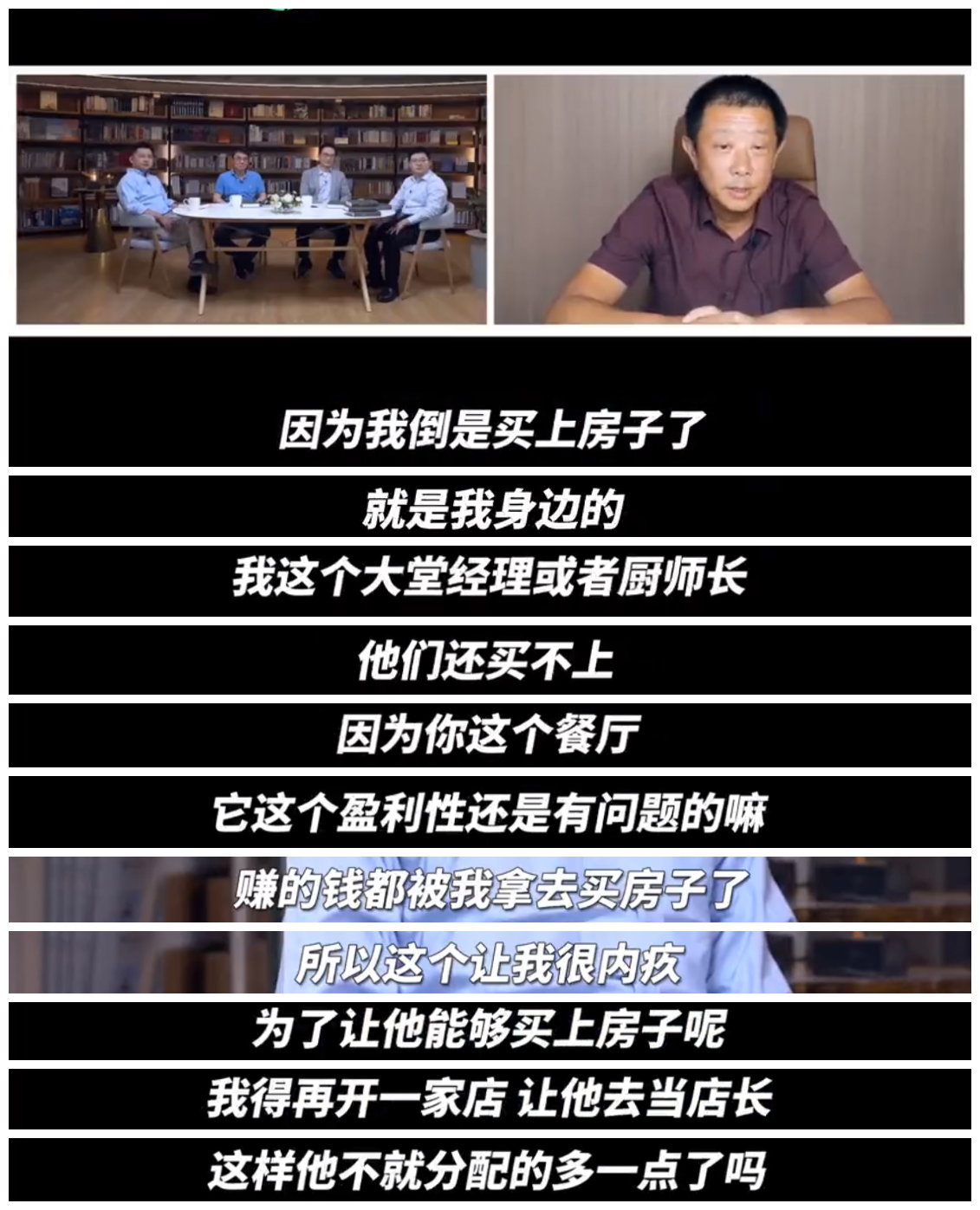 但是我陷入了一个怪圈,因为我倒是买上房子了,但是我身边的大堂经理或者厨师长,他们还买不上。赚的钱都让我拿去买房子了,这个让我很内疚,所以我就没办法,为了让他们能够买上房子,我得再开一家店,让他去当店长,这样他不就分配得多一点了吗?这是我的一个想法,也叫责任感吧。