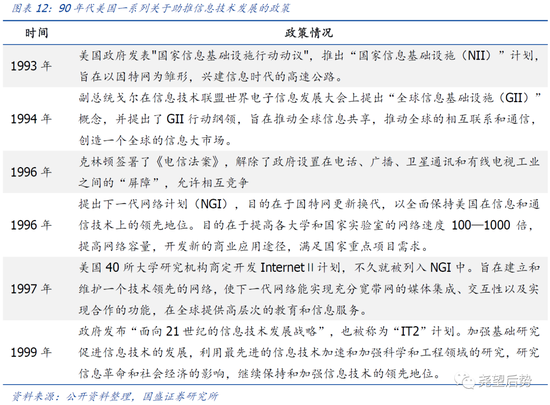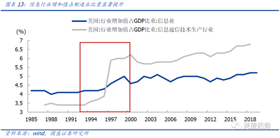 美国政府推出了一系列助推高科技产业、尤其是电信计算机产业发展的政策。80年代末,美国经济增速持续下滑,新上台的克林顿1993提出了他的经济振兴计划,提出以强投资拉动经济。在预见到信息技术会带来巨大的经济效应和生产力的提高,美国政府将信息技术的发展视为一个新的经济增长点,出台了一系列支持信息产业发展的政策,政策倾斜使得大量资金和人员流入。信息业快速发展,表现为信息产业增加值在GDP中的比重显著提升。信息通信技术生产行业占GDP比重由1999年的3.4%上升到2000年的6.2%,在1996后增长得尤为迅速。