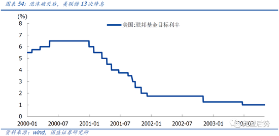 互联网泡沫破灭后,在政策刺激下美股逐渐走出阴霾。泡沫破灭之后,美联储大量运用了利率手段来调节经济,2001年全年共降息11次,基准利率由6.5%下调至1.75%。这样频繁的降息政策是历史前所未有的,降息提供的充裕流动性一定程度上缓解了泡沫破灭对经济的重创。在多种政策刺激与经济周期调节的作用下,经过2至3年的衰退,美国经济渐渐平稳复苏,纳斯达克指数在2002年10月见底后企稳。