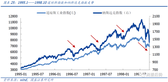 慢牛期间,美股共经历三轮小幅回调与一轮较大幅回调,但持续时间不长、短暂调整后继续向上。以纳指为例:第一轮小回调发生在1996年6月,由于二季度企业盈利能力下降、引发市场对企业持续盈利能力的担忧,叠加利率有所上行,纳指从1996年6月5日的1249点下降到7月24日的1024点,降幅达到18%。第二轮小回调起于1997年1月,受美联储加息25BP、美元指数持续走强引发市场对跨国企业的业务经营预期下降,纳指从1388点下降到1203点,降幅达13%。第三轮小回调为1997年10月,受亚洲金融危机等海外市场恶化的冲击,纳指从1745点下降14%到1500点。第四轮则是1998年7月出现了几年来最大的一次回调,受“香港阻击战”、俄罗斯债务危机爆发以及亚洲金融危机持续的影响,叠加国内PPI指数继续维持在负区间,纳指从1979点下降25%到1499点。