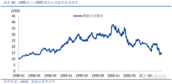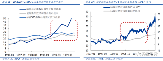 股价的急速上涨和企业的盈利增速已经脱节,科技股的高估值中充盈了泡沫。业绩的大幅提升为股市注入了一支兴奋剂,成为刺激美股指数继续上扬的主要原因。但是盈利的高增速四季度见顶后,盈利快速下滑。纳斯达克指数的表现却远远比企业业绩增速突出,快速上涨的股价与企业实际盈利水平脱节,产生的泡沫不断积累与膨胀。道琼斯指数和标普500指数的PE在1999年10月前见顶后就震荡回调,但是纳斯达克市场的PE涨继续上扬,其正数市盈率由1999年9月的38跃升到2000年3月的65。9月微软公司总裁史蒂夫·鲍威尔指出,包括微软公司在内的科技公司被市场严重高估。