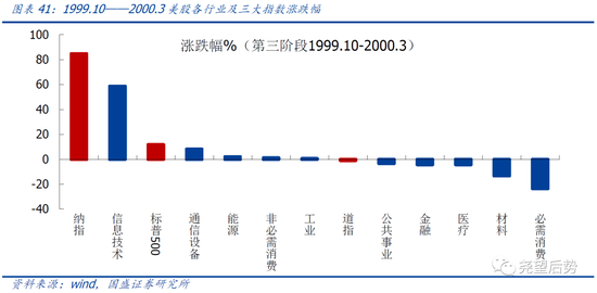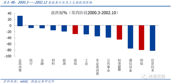 此阶段信息技术行业一枝独秀,半数行业下跌,行业表现极致分化。纳指与信息技术行业大幅上涨85%、59%,而涨幅第二的通信设备仅仅上涨8%,能源、非必需消费品、工业微涨2%以内,公用事业、金融、医疗、材料下跌。