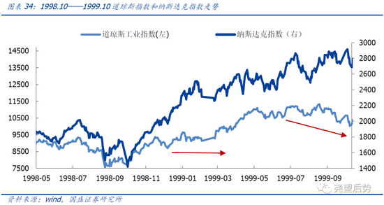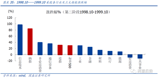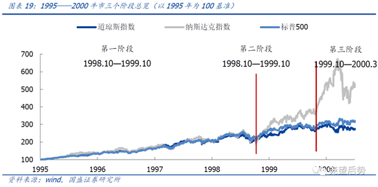1998年底股市触底反弹,纳斯达克指数的涨幅开始明显超过道琼斯工业指数与标普500。1998年10月至1999年10月期间,纳斯达克指数从1419点上升到2916点,涨幅达到105.5%,标普500和道琼斯工业指数上涨幅度分别为38%和39%。在第一阶段,纳斯达克指数实现翻倍用了三年,在第二阶段只用了一年的时间。