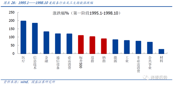 美股三大指数齐齐上行,开启长达三年半全面慢牛行情。1995至1998年10月期间,三大股指震荡上行、实现翻倍,纳斯达克指数、标普500和道琼斯工业指数上涨幅度分别为89%、109%和102%,三大股指走势与涨幅并无太大差异,纳指相对落后。