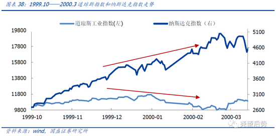 纳斯达克指数增速继续加快,涨幅和道琼斯工业指数、标普500的涨幅差距再度拉大。1999年10月19日至2000年3月10日期间,纳斯达克指数由2688点上涨至顶点5048点,涨幅达88%。而道琼斯指数和标普500涨幅分别为-2%和11%,增速快速下滑,与纳斯达克的差距越来越大。自2000年1月起,道琼斯指数和标普500开始双双下行,以纳斯达克为代表的“新经济”股票已脱离了大盘的“掌控”。