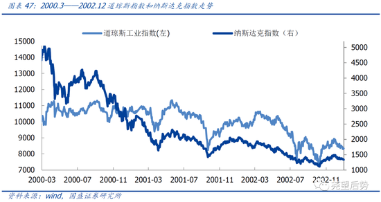 纳斯达克指数见顶后开始下跌,一场互联网泡沫在纳斯达克的狂跌下化为泡影。纳斯达克指数自3月10日的5050点跌至3月15日的4580点。4月,受微软判决等多种因素的影响,纳斯达克指数继续下跌,由4月3日的4446点下跌至4月14日的3321点。6月迎来反弹,但反弹时间不长。9月继续急速下跌,到年底时纳斯达克指数下跌至2470点,跌幅达51%。直到2002年9月,纳斯达克下跌幅度达到近80%才企稳。前期并未大幅上涨的道指在这段时期内横盘震荡、跌幅较小。