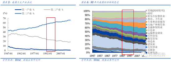 经济转型效果凸显,经济结构不断优化,表现为第三产业占比持续抬升,制造业高端化,IT、金融及服务业崛起。经济结构延续80年代转型趋势,第三产业持续上行、第二产业逐步回落。从行业来看,一是制造业占比持续下滑,由1990年的16.7%下降到2001年的13.9%,但其中计算机和电子产品的制造业增加值占全部制造业增加值的比重逐渐提升,制造业向高端化迈进;二是IT行业崛起,信息业对GDP贡献度稳步抬升;三是金融业及服务业迎来飞速发展,金融业和保险业、专业和商业服务增加值共占GDP比重由1990年的14.9%上升到2001年的18.5%。