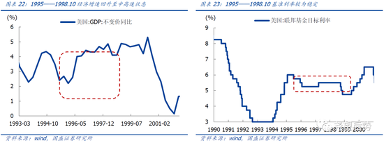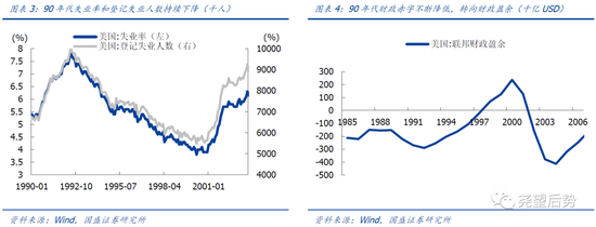 1995年四季度经济增速见底回升,1996年至1998年经济增速快速攀升,并始终维持在4%以上。同时,失业率不断下降,联邦财政赤字规模继续缩小,在1998年首次出现财政盈余。虽然受到亚洲金融危机等海外市场波动的影响,但美国经济基本面在这一时期长期向好的趋势没有变。