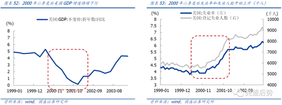 同时,科网泡沫的破灭,也让2000年的第二季度成为美国经济基本面的一个转折点,美国经济开始走入了长达3年的衰退期。虽然2000年整年的GDP增速维持4.1%的高位,但在二季度达到5.3%后开始一路下行,2000年底增速已跌至2.97%,下行至2001年第四季度的0.15%。失业数据在4月见底,当月失业率为3.8%,登记失业人数为548.1万人,5月失业率上升为4%,之后一路上升。为了拯救经济,美联储基准联邦利率在二季度达到6.0%,之后开启了漫长的降息周期,降息次数多达13次。