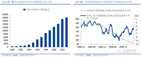 90年代科技周期使得互联网迅速普及,美国率先进入互联网时代。经过80年代的技术积累,90年代美国信息技术行业开始迅猛发展,一系列互联网新技术和新理念涌现,在互联网发展的历史上留下深刻的烙印。IBM带领人们走进PC时代,英特尔、微软分别垄断计算机行业上下游,由此,计算机行业形态由硬软件服务一体化转向分工合作。整个社会进入信息爆炸时代,催生出以雅虎为代表的门户网站,也由此奠定了互联网行业免费、开放、盈利的商业模式。1990年到1999年间,美国互联网户数量从200万增长到超过1亿。自此互联网真正走向社会,成为引领时代变革的创新力量。
