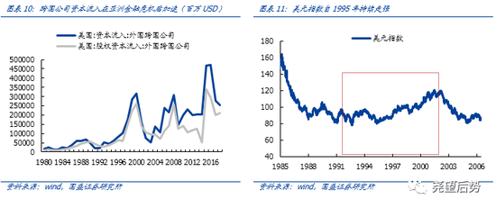 海外市场波动较大,大量资金流向美国。亚洲金融危机导致资本在新兴国家的投资回报率降低和风险增大,而美国经济表型优异,高科技产业快速发展,资本在退一步悬崖、进一步桃园的情况下大量涌入美国市场。通过跨国公司的资本流动自1992年加速流入美国市场,从192亿美元上升到2000年顶点的3140亿美元,尤其是亚洲金融危机爆发之后,资本流入量继续加大。美元指数自1995年持续走强,从82左右上升到2000年的110以上,美元资产吸引力加大。