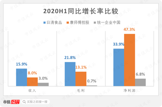 总的来说,从2020年上半年的同比增速来看,三家公司中,日清食品实现了最高的收入和毛利增速,康师傅控股则实现了最高的净利润增速。