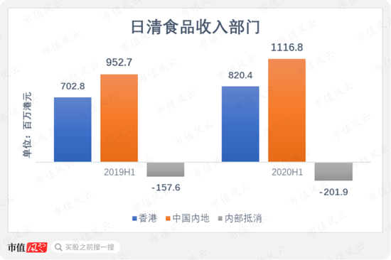 2020年上半年,日清食品的收入为17.4亿港元,其中11.2亿港元来自中国内地,8.2亿港元来自香港(注:内部抵消收入2.0亿港元)。