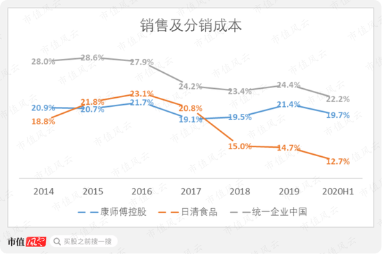 2020年上半年,按销售及分销成本排名依次为:日清食品12.7%,同比下降1.4个百分点;康师傅控股19.7%,同比下降1.1个百分点;统一企业中国19.7%,与去年同期的22.1%基本持平。