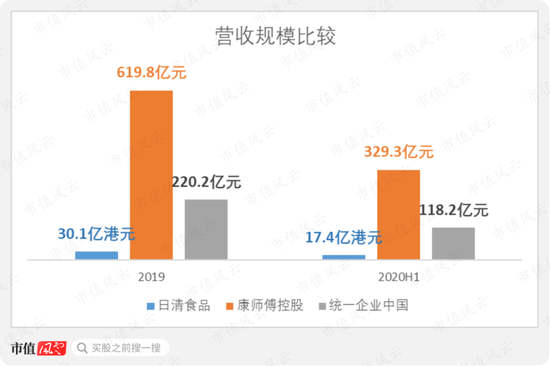 需要指出的是,三家规模有较大差距。2019年,三家公司按年营收规模的排名依次为:康师傅控股620亿元、统一企业中国220亿元、日清食品30亿港元(约合28亿元人民币)。