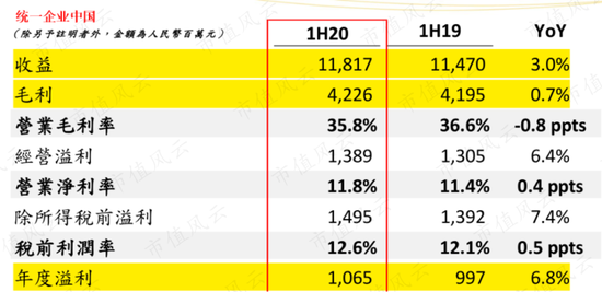 2020年上半年,统一企业中国的收入为118.2亿元,同比增长3.0%;毛利为42.3亿元,同比增长0.7%;净利润为10.7亿元,同比增长6.8%。