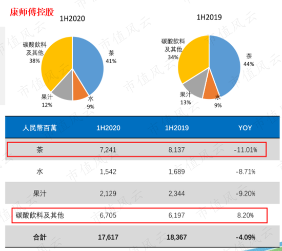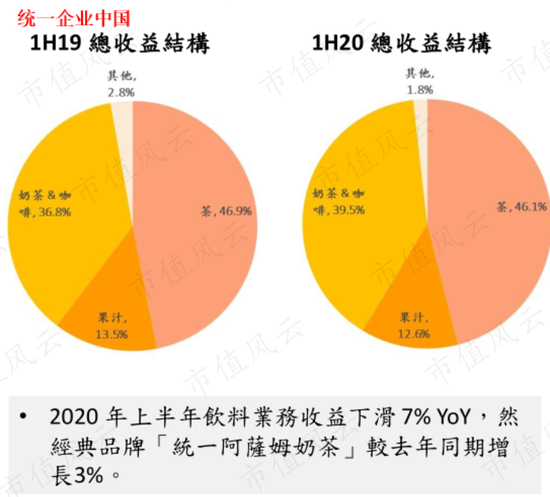 2020年上半年,除了奶茶和咖啡外,统一企业中国的其他类别的饮料收入均出现下滑。