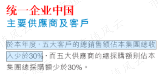 康师傅控股和统一企业中国未在财报中披露前五大客户的具体销售额占比。但两家公司均表示,2019年,其前五大客户的合计销售额占比,不超过同期总收入的30%。