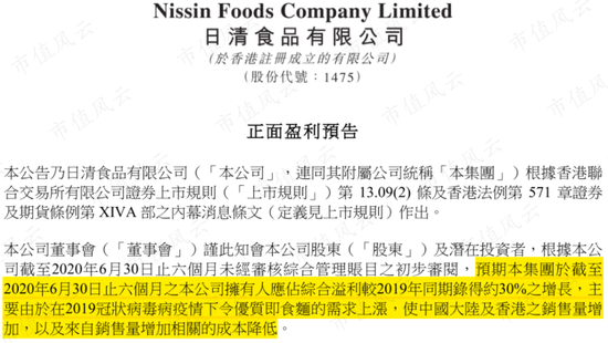 业绩增长的原因是新冠疫情带动的“宅经济”。日清食品在公布中期业绩前已发布预盈,称新冠疫情期间方便面需求上涨,该公司在中国内地及香港的方便面销售量均出现增长。