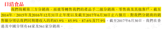 据日清食品的招股书披露,在上市前的2014-2016年,公司每年有80%以上的销售额来自对分销商的销售。