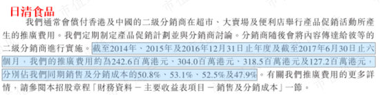 推广费用通常是销售及分销成本的最大构成部分。根据日清食品招股书披露,2014-2016年,推广费用占同期销售及分销成本的50%以上。