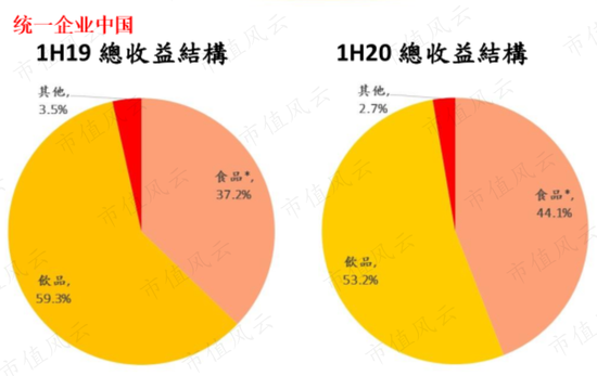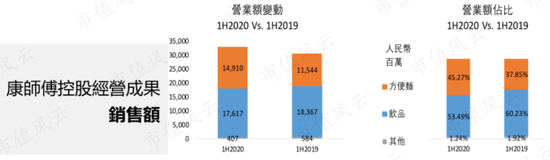 2020年上半年,以方便面为主的食品业务的营收占比为44.1%,同比提升6.9个百分点;饮品业务的营收占比为53.2%,同比下降6.1个百分点。