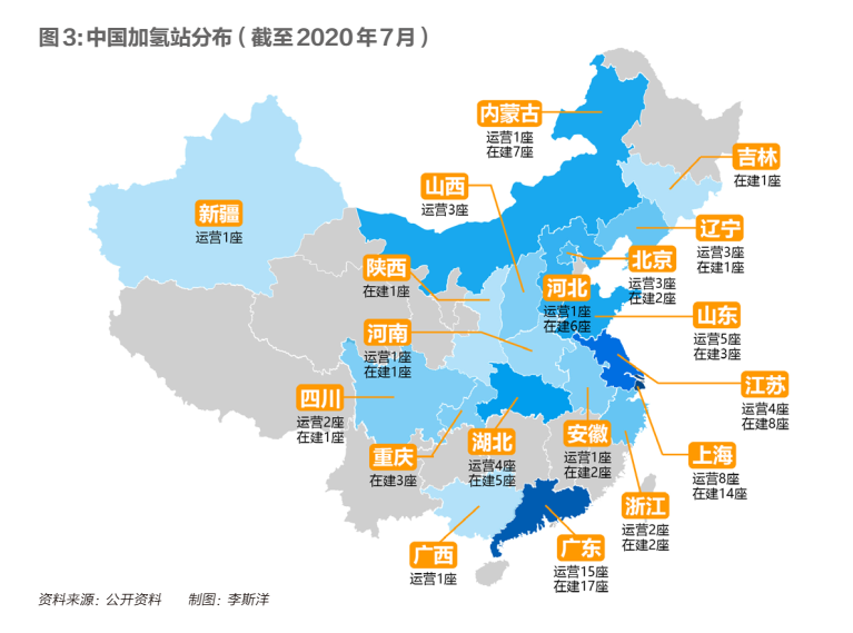 目前,中国已有6000多辆氢燃料电池商用车在运行,主要是大巴和各种特种车。加氢站数量在2016年以后快速增加。截至今年7月,中国累计建成加氢站76座,投入运营的有52座。其中广东省拥有量最大,有15座运营,17座在建。