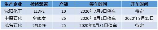 7月份,PE国内炼化企业涉及到的检修装置转而减少。当月停车检修损失量在25.52万吨,减少1.8万吨。检修企业主要有中煤榆林全密度装置、宁夏宝丰全密度装置等。7月PE产量环比上涨2.14%至155.26万吨,较去年同期增加1.25%。