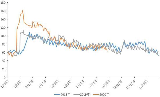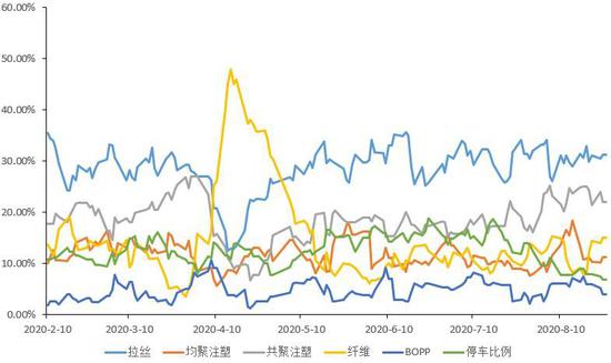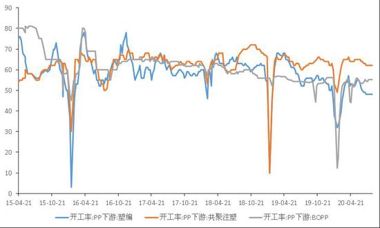 PP作为刚需消费品,有着“金九银十”的旺季趋势,一般8月中旬开始到11月上旬,PP下游的塑编和共聚注塑的需求增加,其开工率稳步提高。BOPP则是表现平稳。目前塑编、共聚注塑、BOPP开工率分别在48%、62%和55.2%。