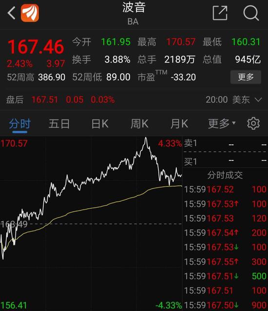 当地时间周三,波音美股低开一度跌1.7%,随后反弹拉升,一度涨逾4%,最终收盘涨2.43%。