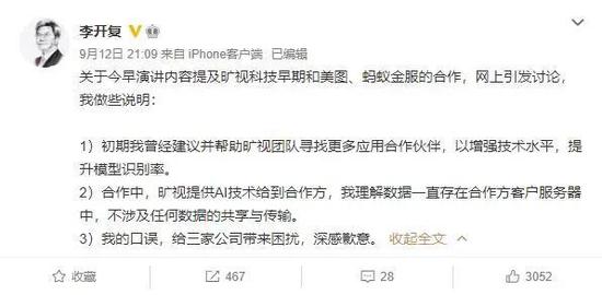 李开复称帮旷视拿人脸数据 蚂蚁旷视紧急澄清