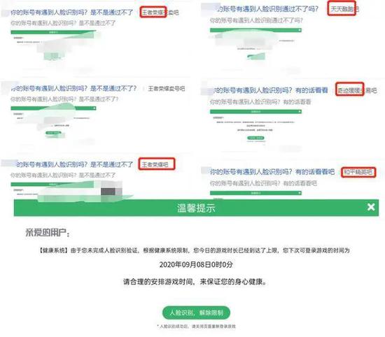 而在贴吧等平台中,另有卖家以未成年人中的游戏群体为主要对象售卖人脸,由于健康系统防沉迷限制,未成年人通过人脸认证后游戏时长有限。此类卖家以人脸识别解除限制为由头,若未成年人成功通过此方式进行验证,防沉迷系统的时间限制或形同虚设。