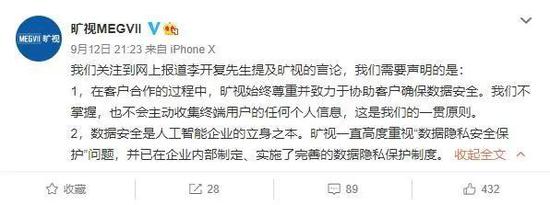 随后,旷视科技官微“旷视MEGVII”发布消息称,已关注到李开复提及旷视的言论。