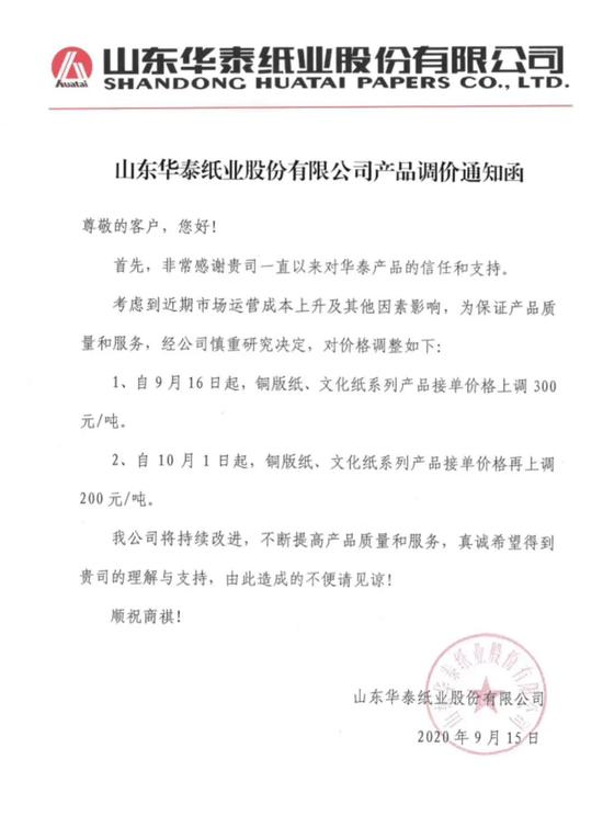 从华泰股份这份涨价函可以看到,纸企这轮涨价非像此前一样——单次大涨一蹴而就,而是分次调价。华泰股份将对铜版纸、文化纸调整价格,9月16日上调300元/吨、10月1日再上调200元/吨。