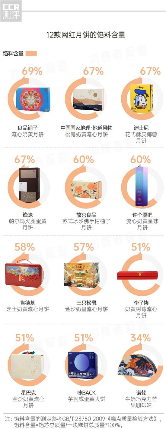 结果显示,良品铺子馅料含量最高,中国国家地理·地道风物、迪士尼、锋味次之,其馅料含量依次为69%、67%、67%、67%。