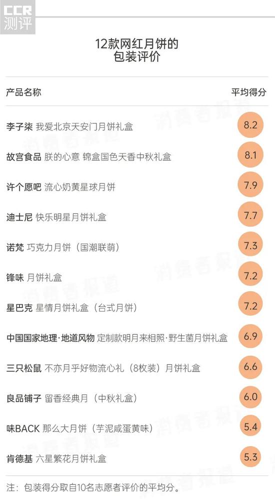 此外,本刊还邀请了10名志愿者对12款月饼的包装进行评分。