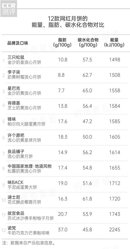 此次测评的12款月饼礼盒,多半是什锦口味。因此,本刊随机抽取了每款月饼其中一个口味,以对比其脂肪、碳水化合物以及能量的标称值。