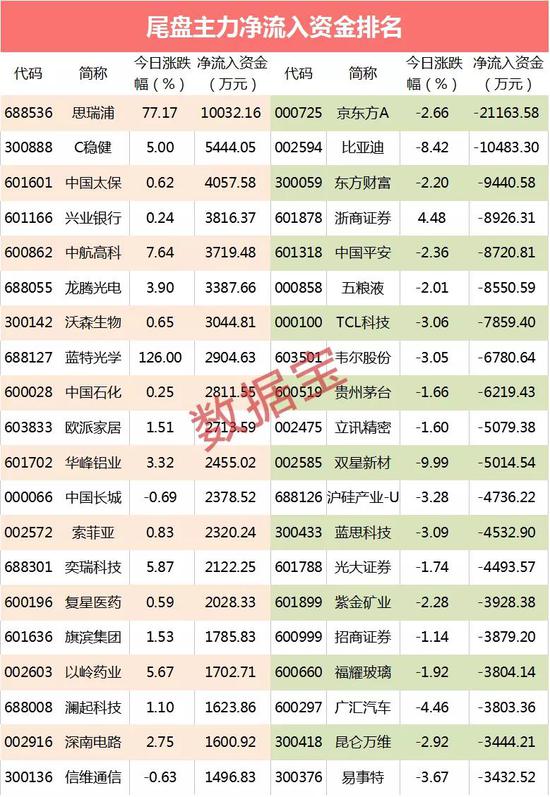 个股方面,尾盘资金流入清淡,仅思瑞浦流入资金超亿元,C稳健流入超5000万元。京东方A、比亚迪尾盘分别流出2.12亿元和1.05亿元。东方财富、浙商证券、中国平安三只金融股流出超8000万元。