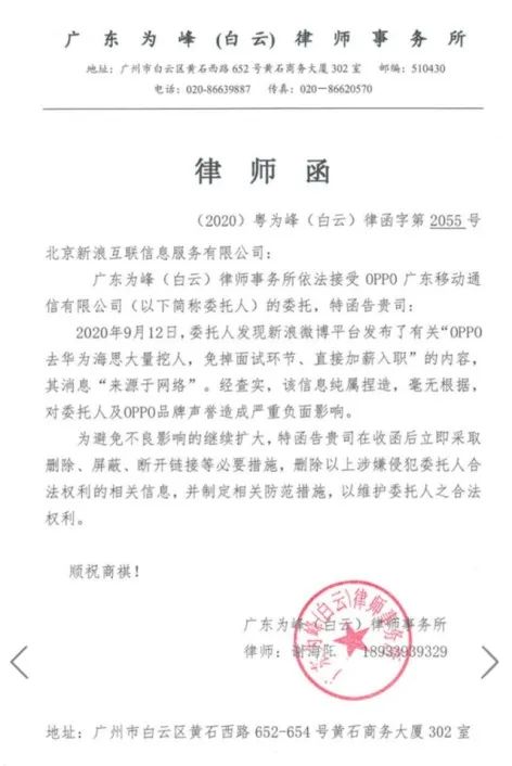 9月14日,OPPO广东移动通信有限公司委托律师事务所发出律师函,表示“经查实,该信息纯属捏造,毫无根据,对委托人及OPPO品牌声誉造成严重负面影响。”律师函还称,“为避免不良影响继续扩大,特函告贵司在收函后立即采取删除、屏蔽、断开链接等必要措施,以维护委托人之合法权利。”