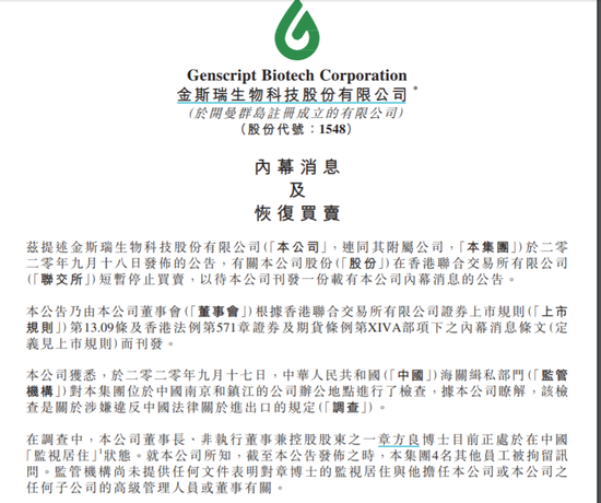 金斯瑞生物(01548-HK)公布,该公司获悉,于2020年9月17日,中国海关缉私部门对该集团位于中国南京和镇江的公司办公地点进行了检查,据该公司瞭解,该检查是关于涉嫌违反中国法律关于进出口的规定。在调查中,该公司董事长、非执行董事兼控股股东之一章方良博士目前正处于在中国“监视居住”状态。就该公司所知,截至本公告发布之时,该集团4名其他员工被拘留讯问。监管机构尚未提供任何文件表明对章博士的监视居住与他担任该公司高级管理人员或董事有关。
