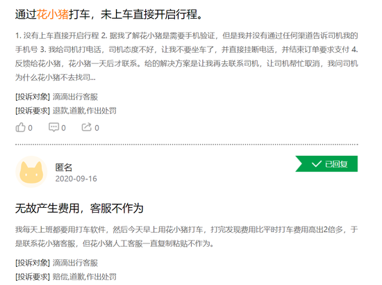 随着业务规模扩大,各大社交媒体平台开始频繁出现用户针对花小猪的投诉和吐槽,主要围绕司机素质底下,无故取消订单,平台功能不完善等。