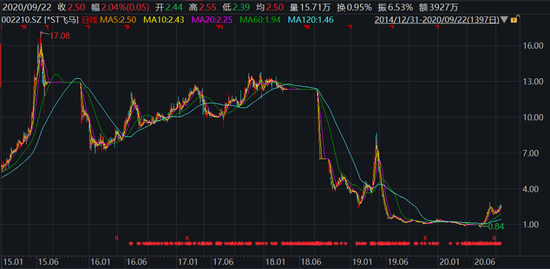 尽管今天*ST飞马股票上涨2.04%,但把时间拉长一点来看,在2015年6月公司股价最高曾达到过17.08元,比起今天2.5元的收盘价,公司股价已经跌去了85%。并且,就在6月,公司股价一度跌至0.84元,较高点下跌95%。