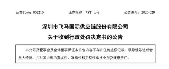 对此,深交所对*ST飞马及相关当事人做出公开谴责及通报批评的决定,并将处分决定计入上市公司诚信档案,并向全社会公开。
