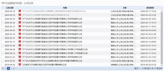 Wind咨询显示,从2019年4月至今,*ST飞马已经做出15次风险提示。