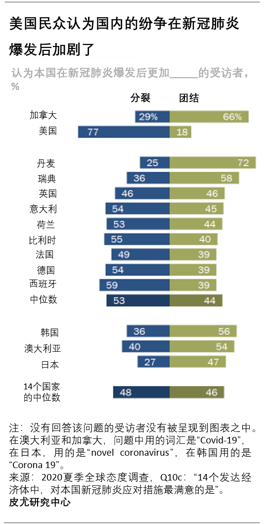 在政治分化的时代,美国对大流行没有统一的应对措施,超过四分之三的受访者认为自己的国家现在比大流行之前更加分裂。